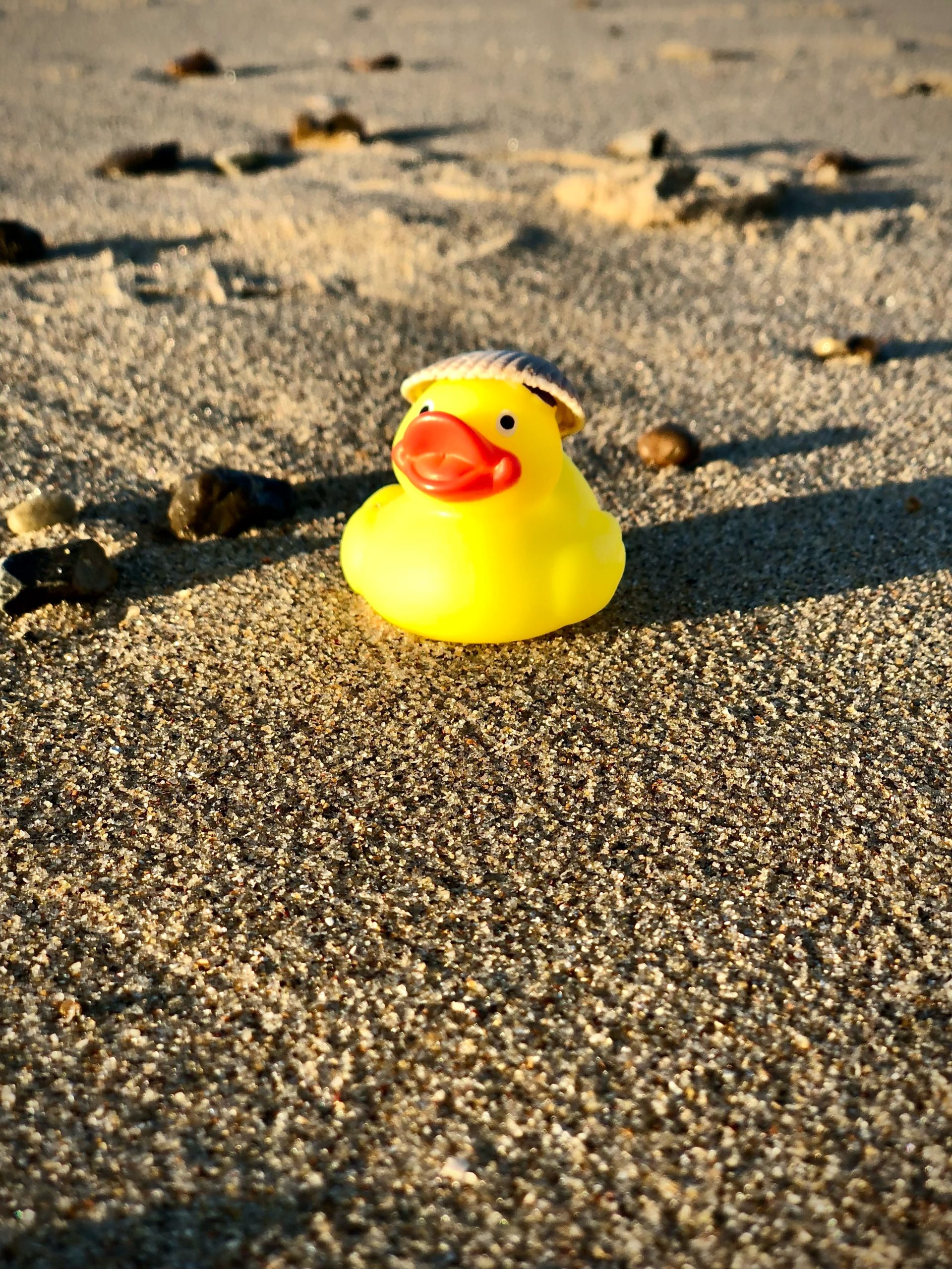 I couldn’t help but laugh at the pure charm of the scene. The absurdity was delightful, yet, in some strange way, there was also something abstractly beautiful about it. The vibrant yellow of the duck against the muted beige of the sand, the natural curves of the shell adding character to the quirky figure, and the playful shadow cast by the low sun, all of it came together to create a moment that felt both simple and profound.