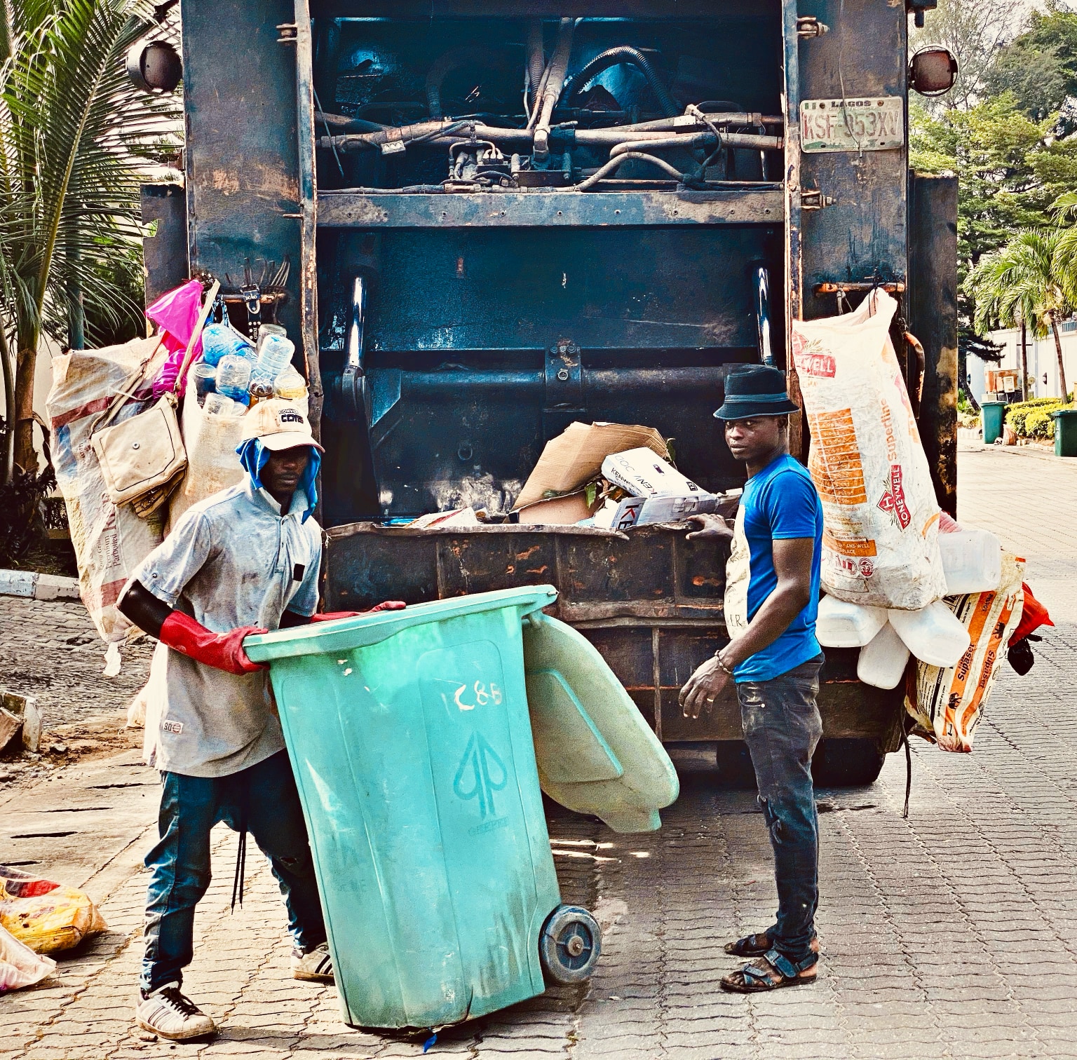 This shot captured a moment of everyday labour, as two men go about their essential task of garbage disposal. Against the backdrop of a worn-out garbage truck, these men performed a humble yet vital service to the estate. The bright, discarded materials hanging from the truck contrast with the muted tones of their work, highlighting the daily reality of waste management. There’s a quiet dignity in their actions—a reminder that their labour keeps the estate clean and functioning. This shot illustrates the rhythm of urban life, where even the simplest, often overlooked tasks are crucial to the order and flow of society.